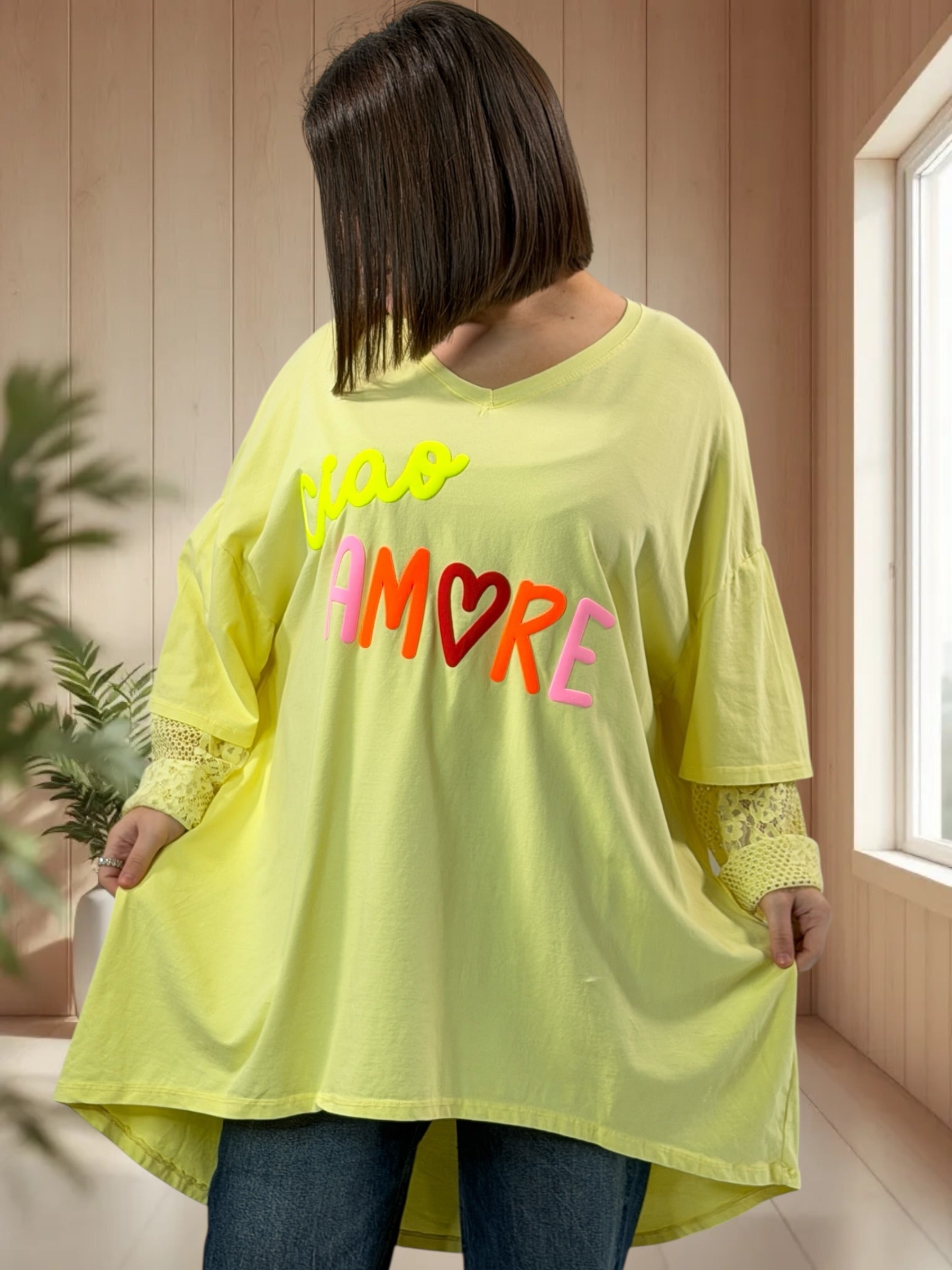 AMORE - TEE-SHIRT JAUNE MANCHES EN DENTELLE JUSQU'A LA TAILLE 54