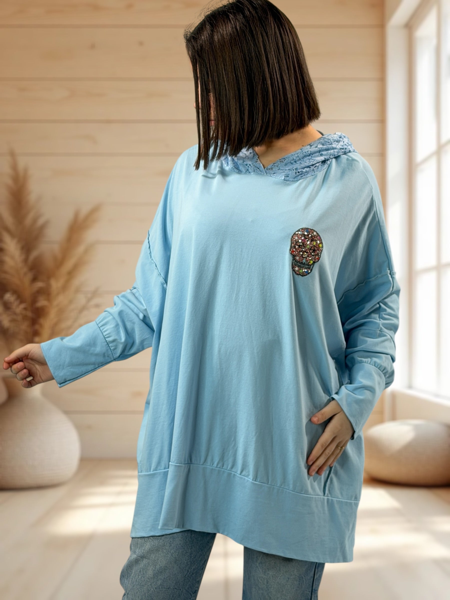 CARACAS - TEE-SHIRT BLEU OVERSIZE CAPUCHE EN DENTELLE JUSQU'A LA TAILLE 58