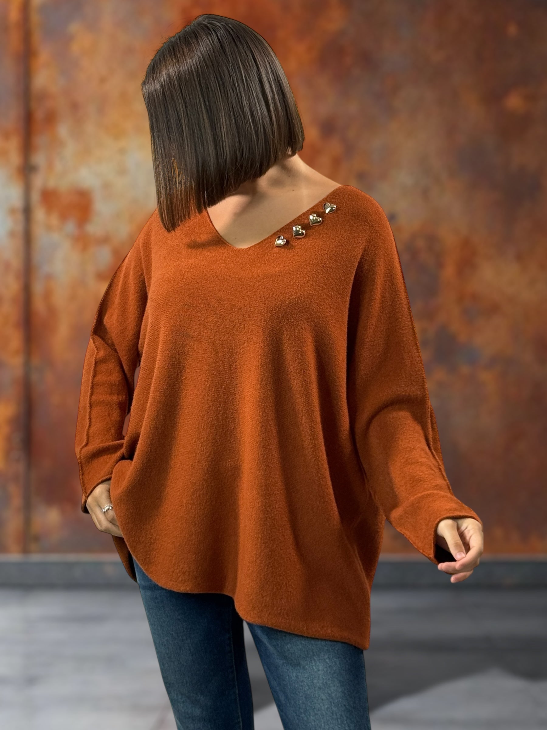 CELINE - PULL OVERSIZE ROUX AVEC BOUTONS COEUR JUSQU'A LA TAILLE 52