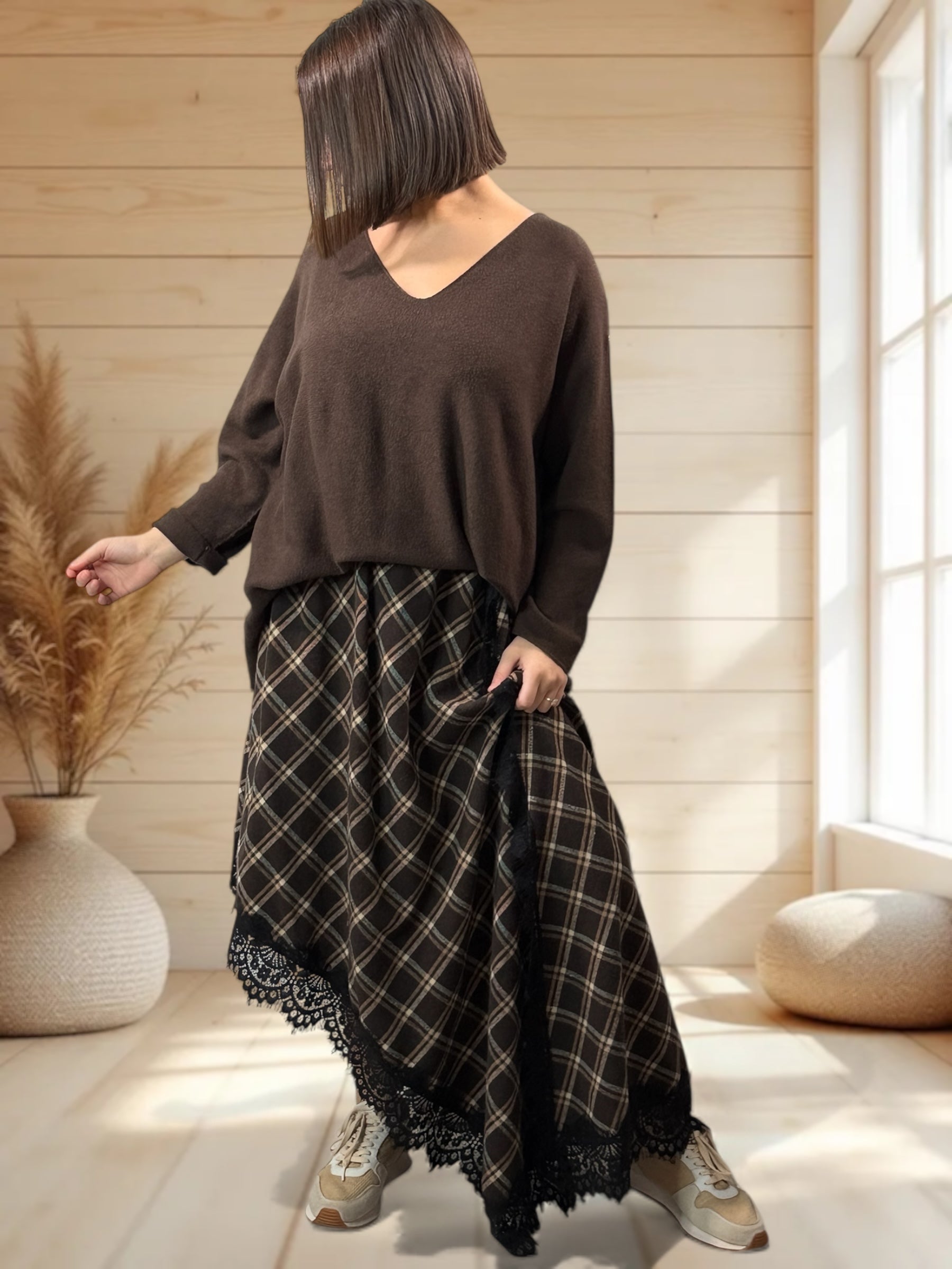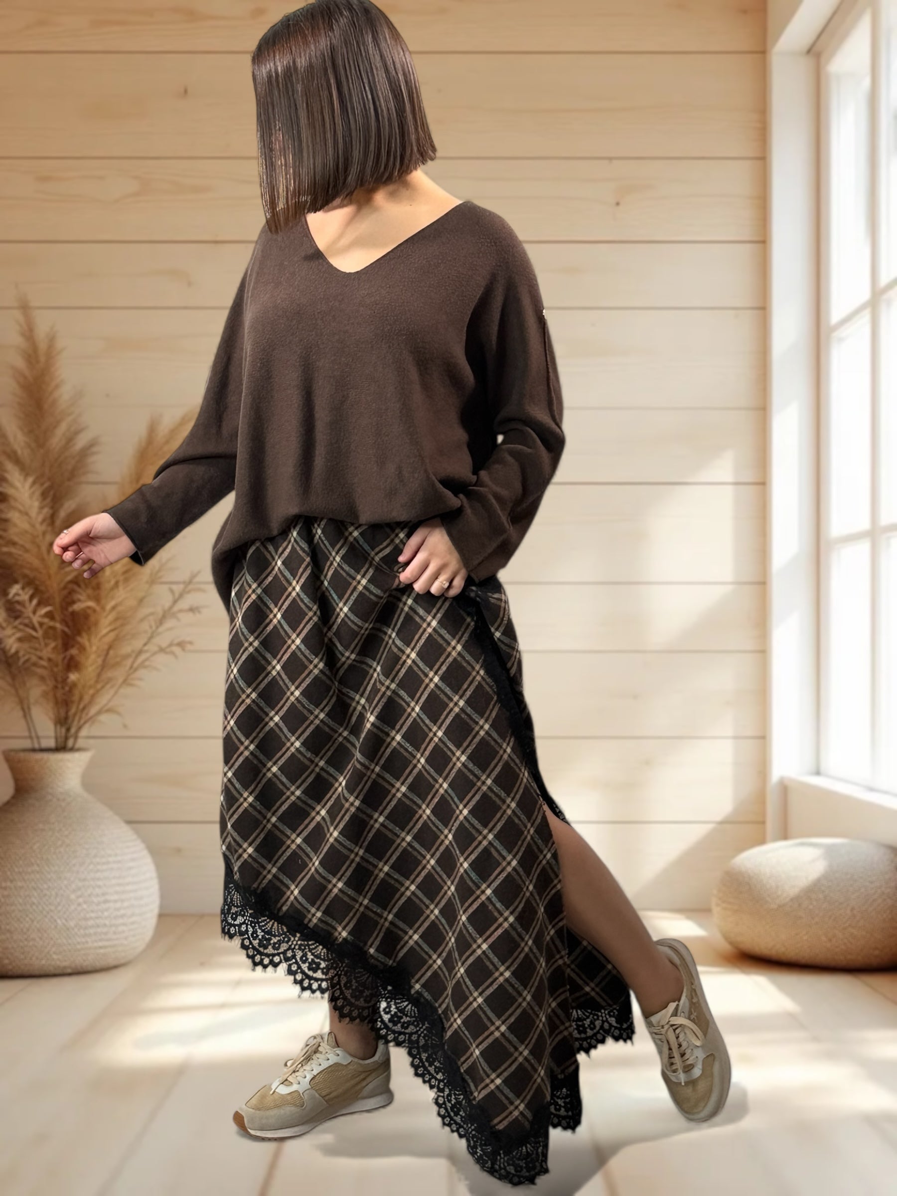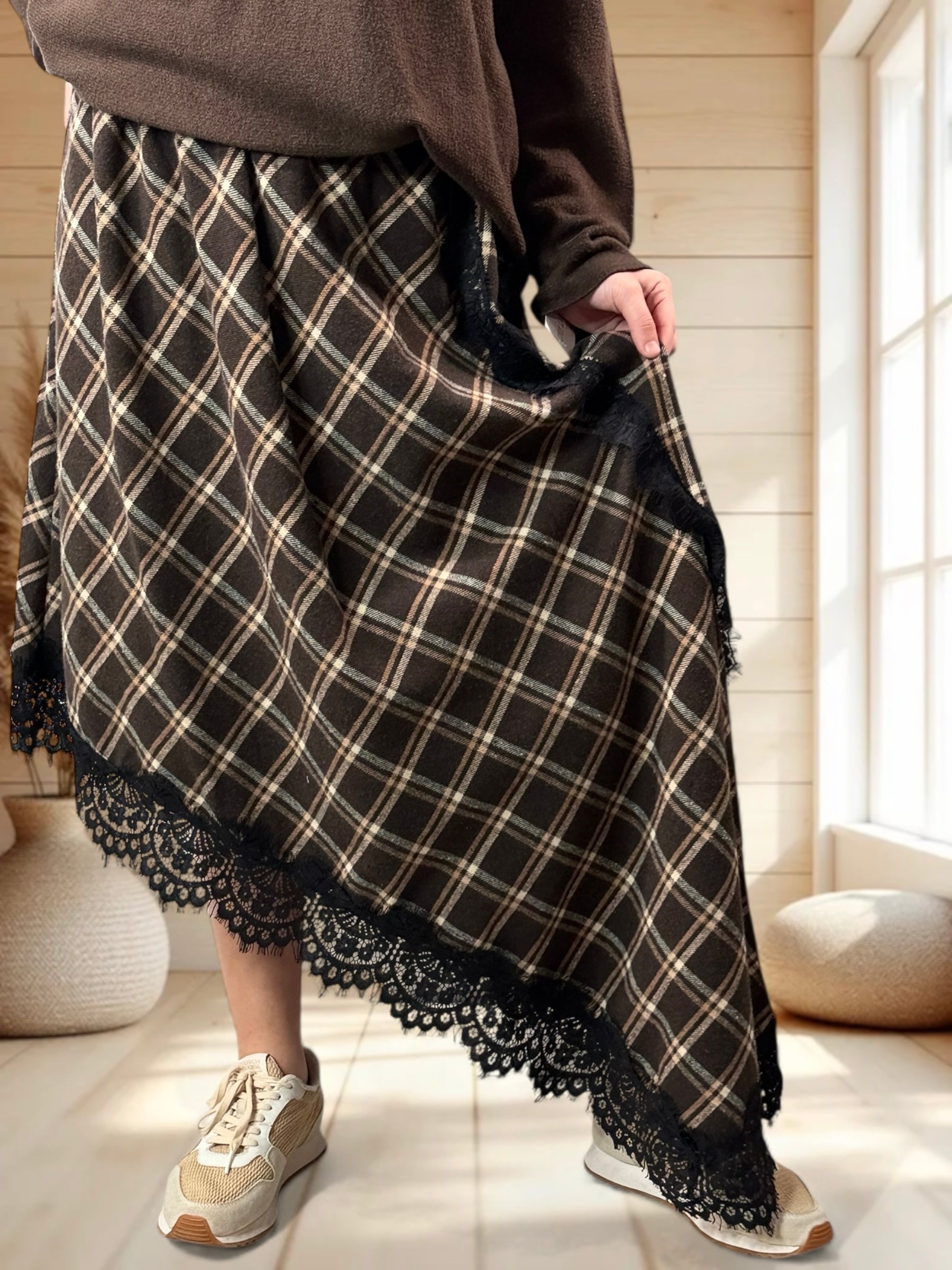 EDIMBOURG - JUPE ECOSSAISE MARRON AVEC DENTELLE JUSQU'A LA TAILLE 50/52