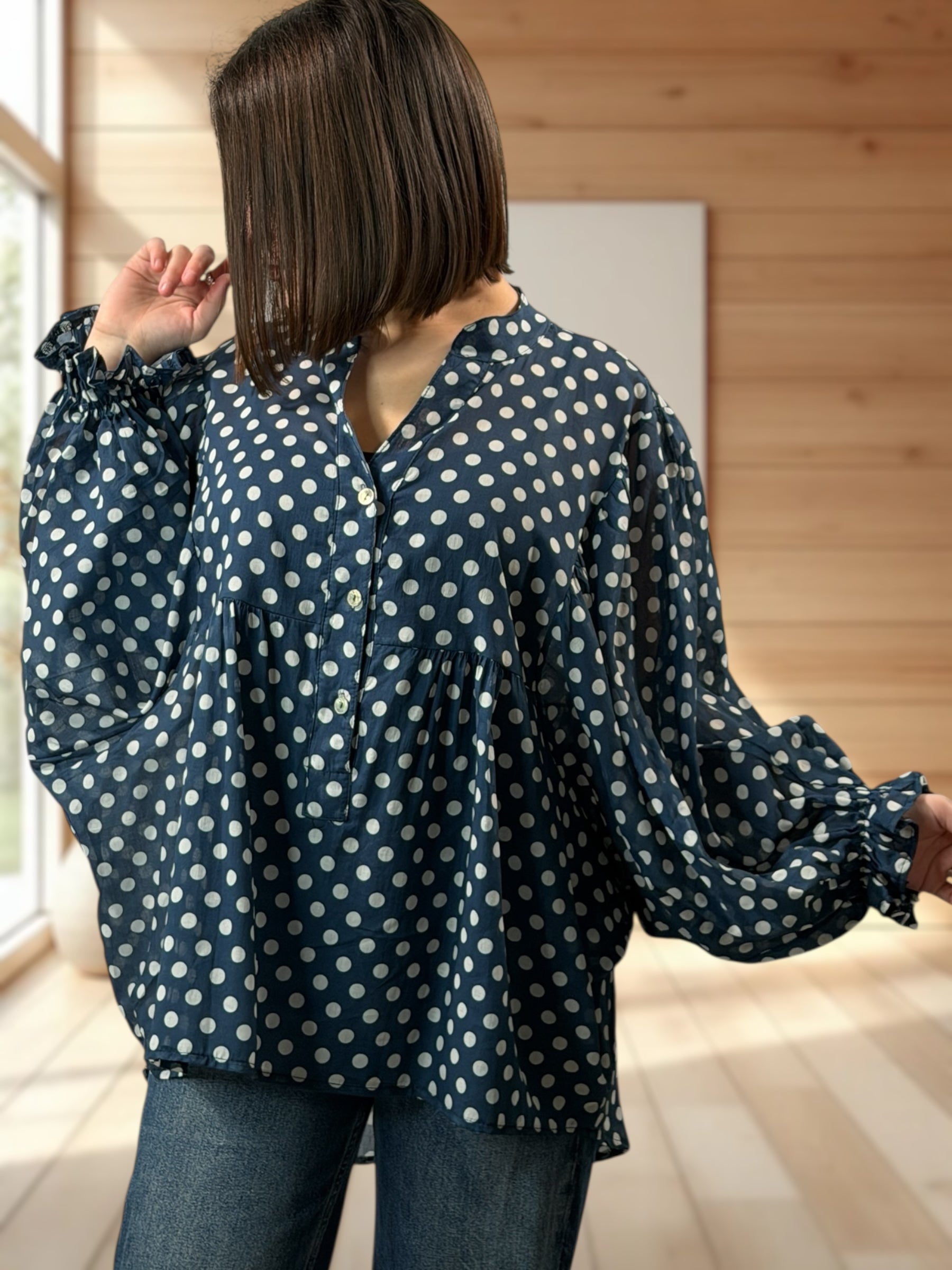 EDITH - BLOUSE MARINE A POIS JUSQU'A LA TAILLE 50/52