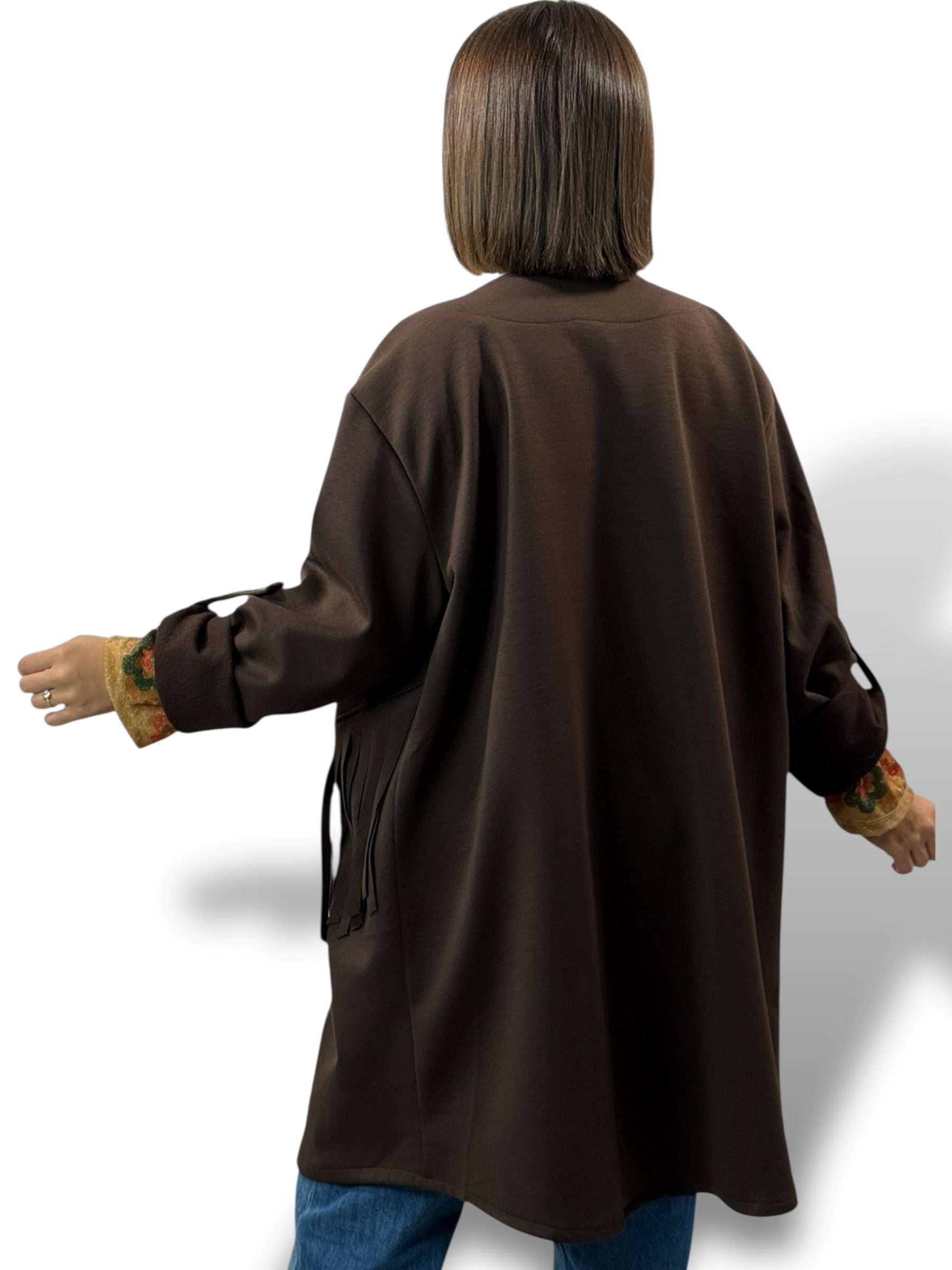 FERIA - VESTE MARRON A FRANGE OVERSIZE JUSQU'A LA TAILLE 52/54