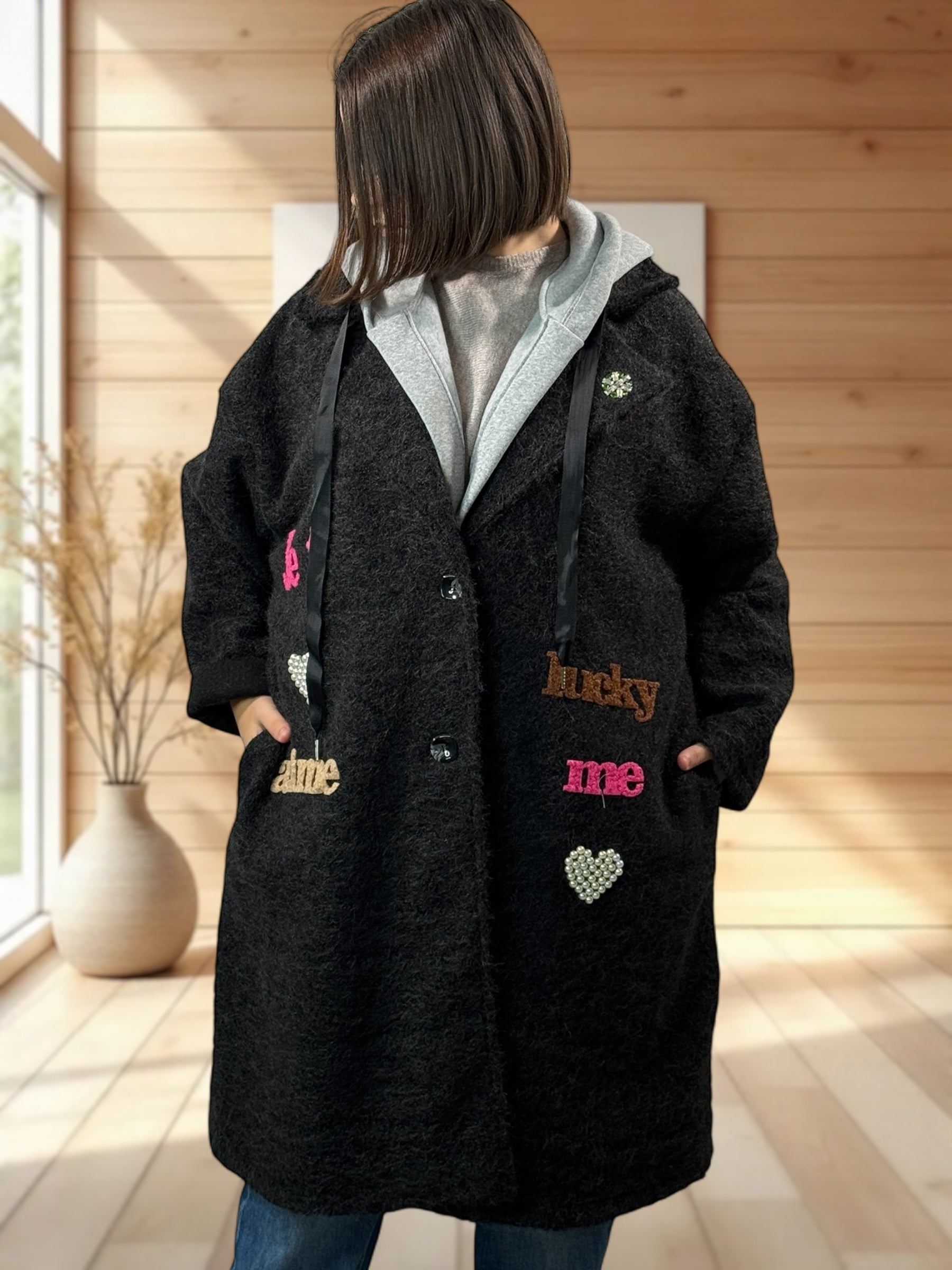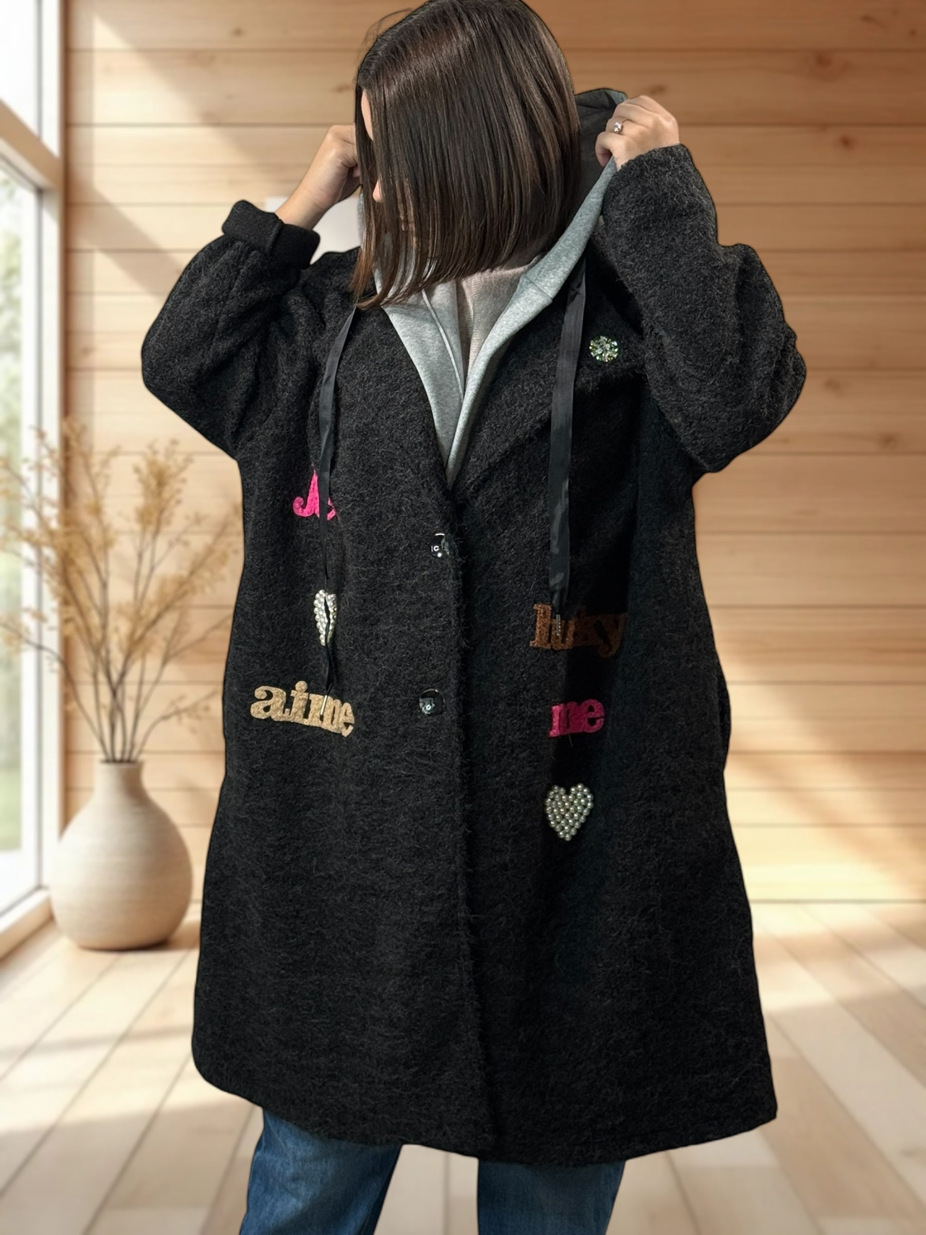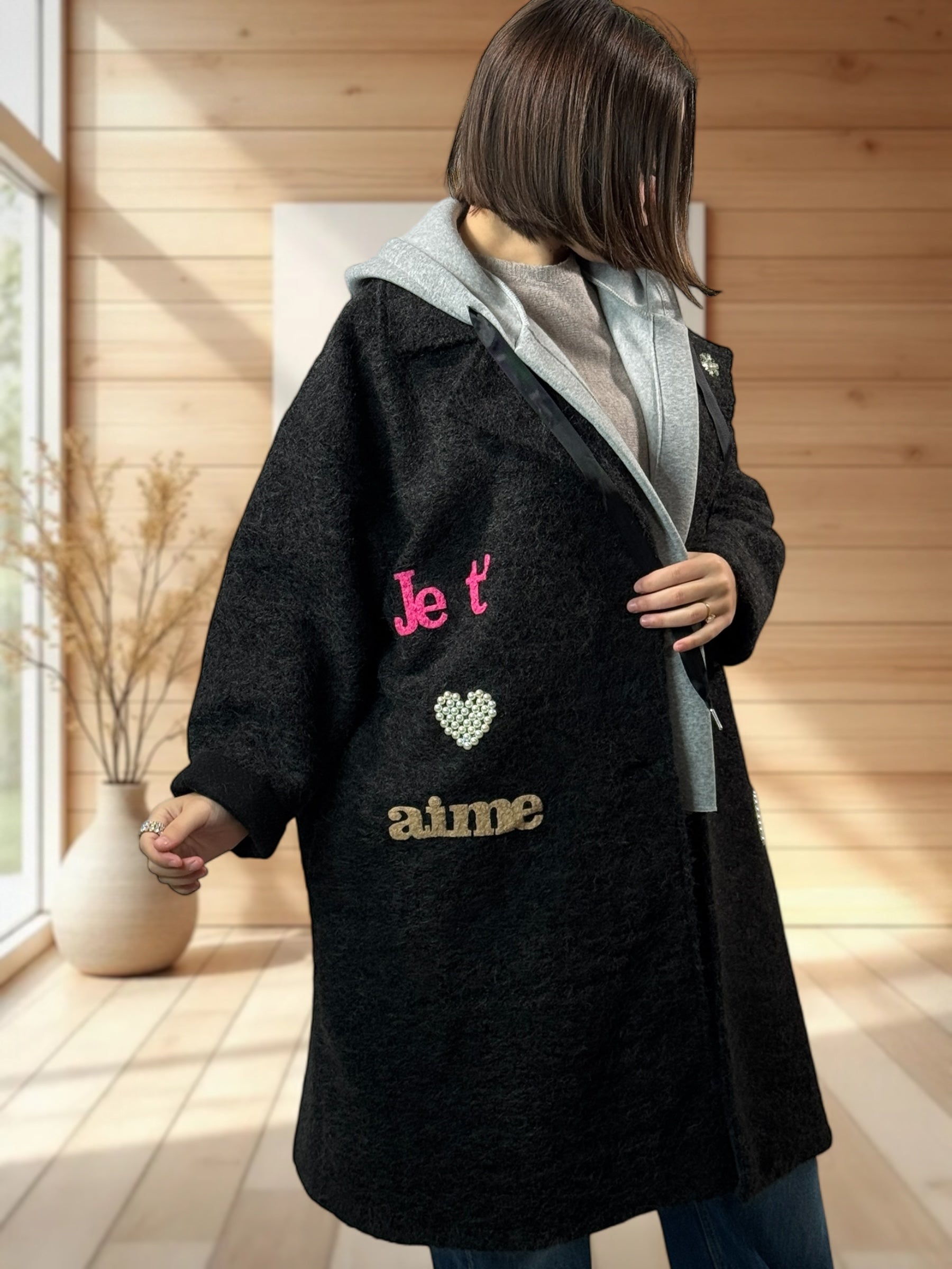 JULIUS - MANTEAU NOIR A CAPUCHE JUSQU'A LA TAILLE 52