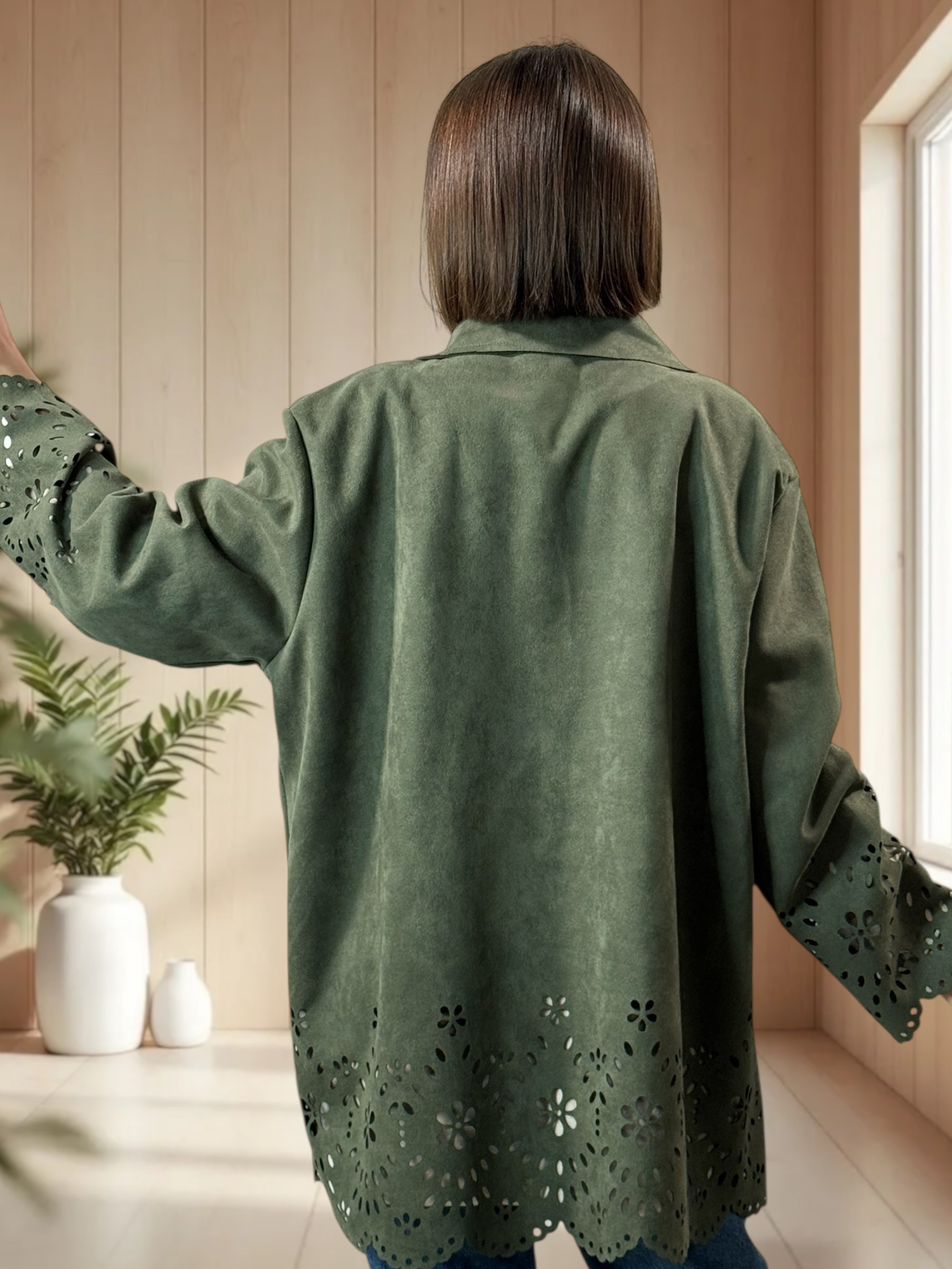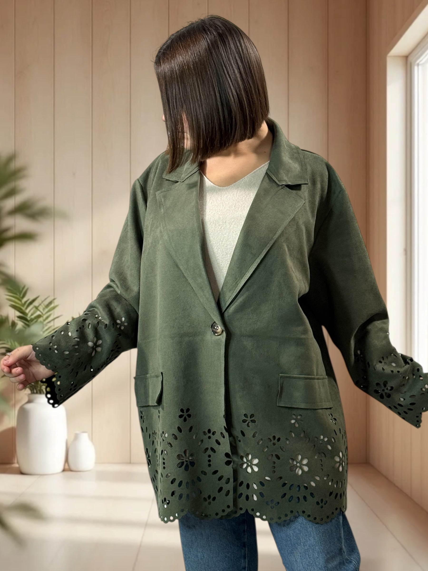 PAMELA - BLAZER KAKI EN SUEDINE DECOUPE DENTELLE JUSQU'A LA TAILLE 52