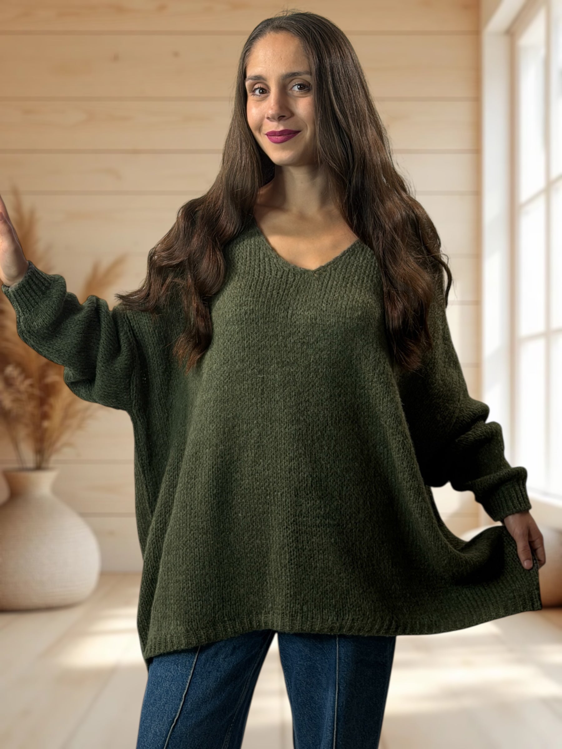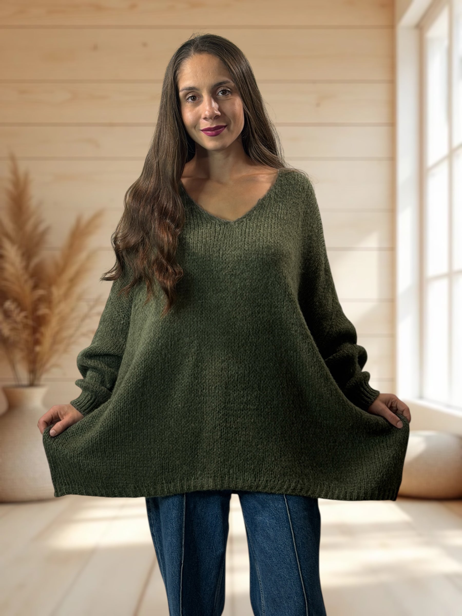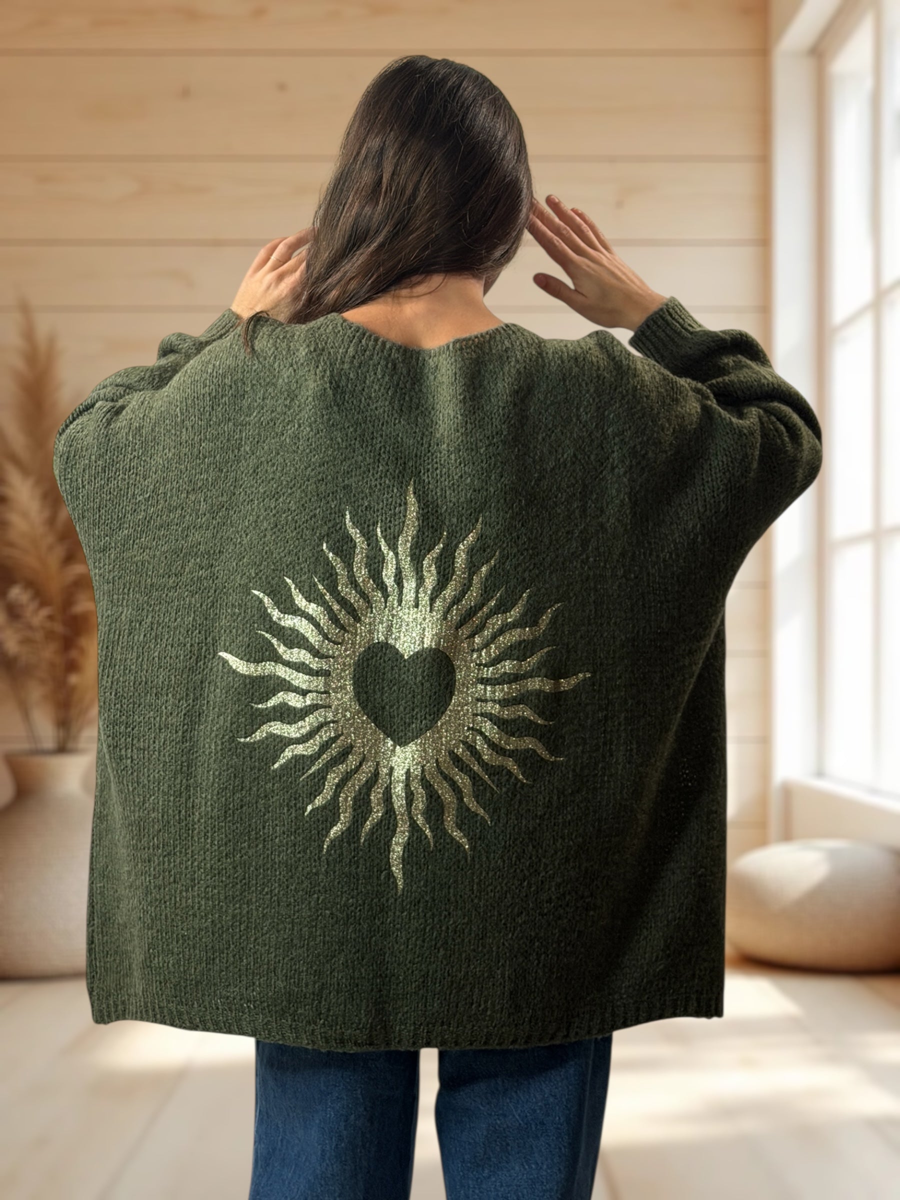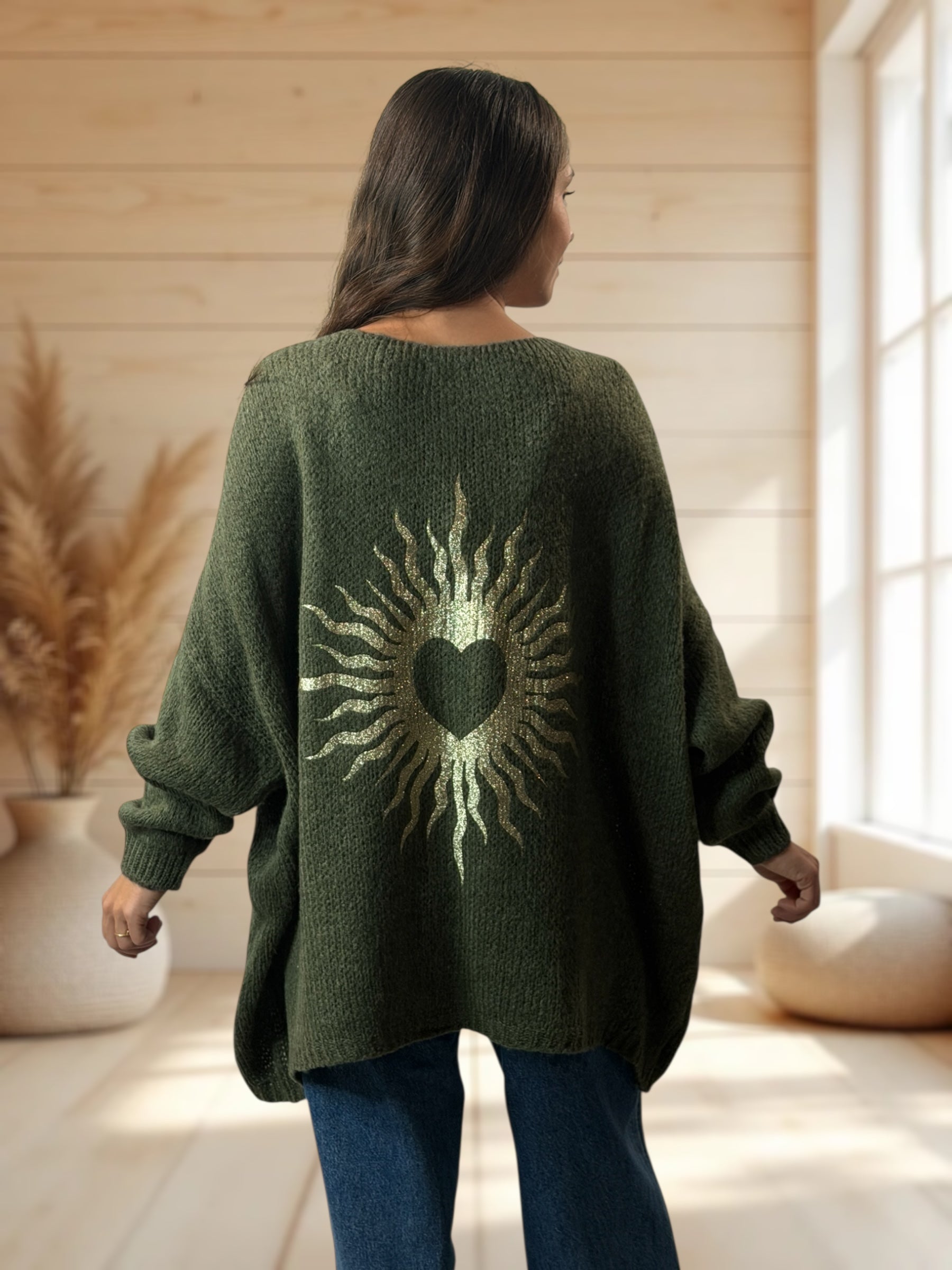 RICKOU - PULL OVERSIZE KAKI MOTIF SOLEIL JUSQU'A LA TAILLE 56