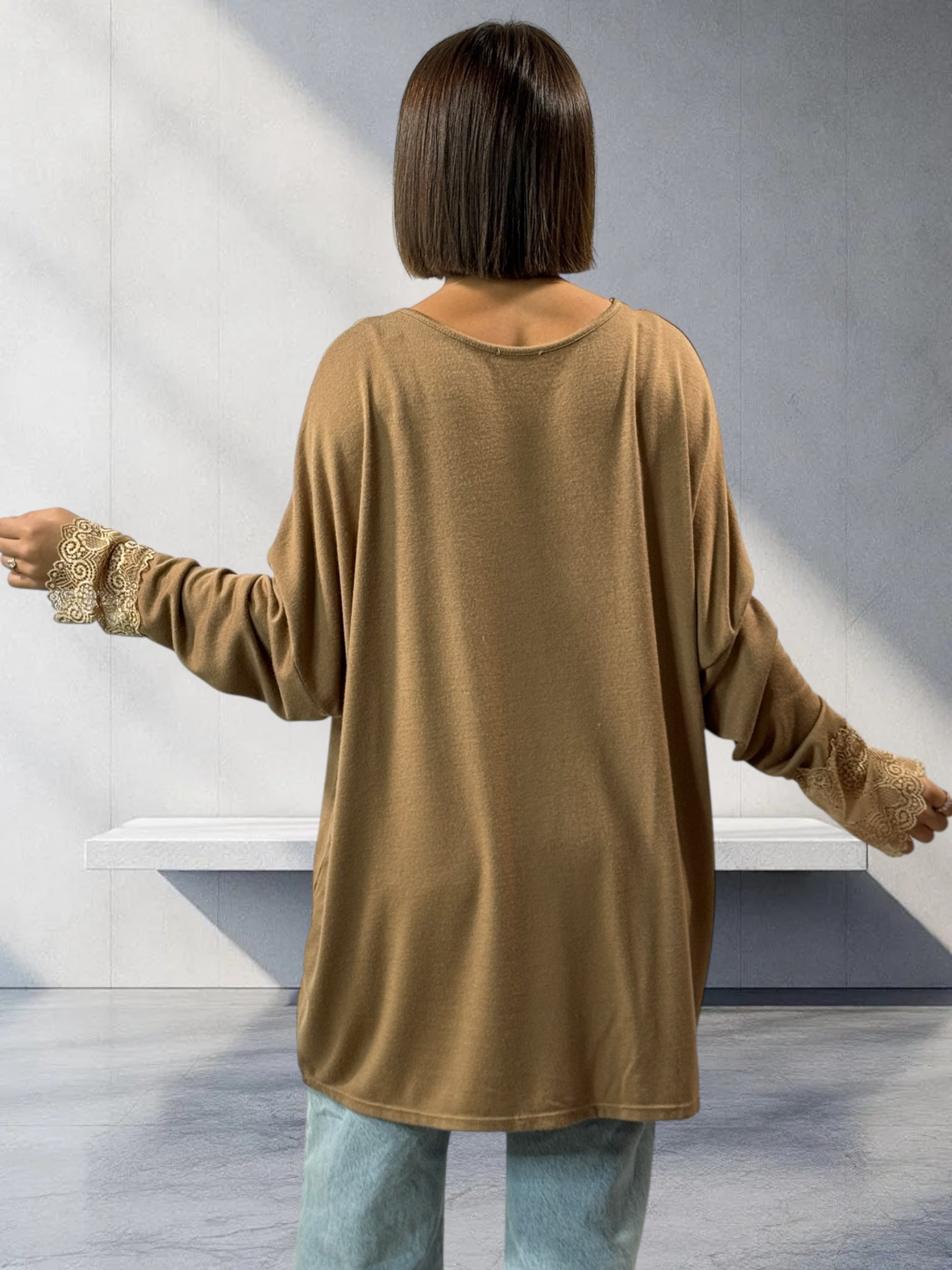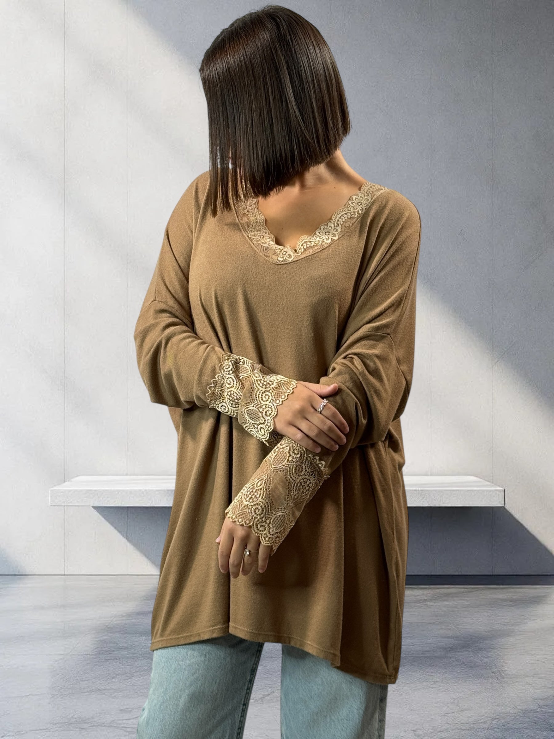 VALENTINA - PULL CAMEL EN MAILLE BORDE DE DENTELLE JUSQU'A LA TAILLE 54